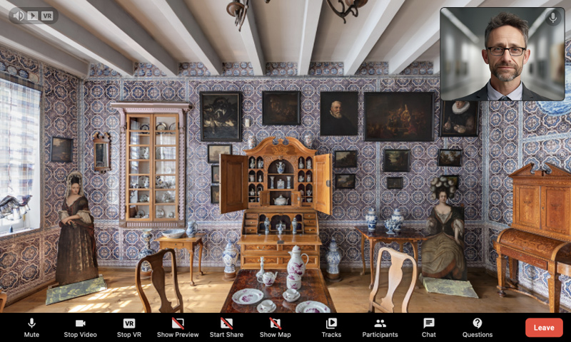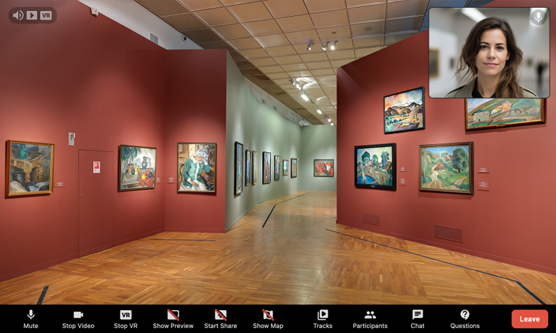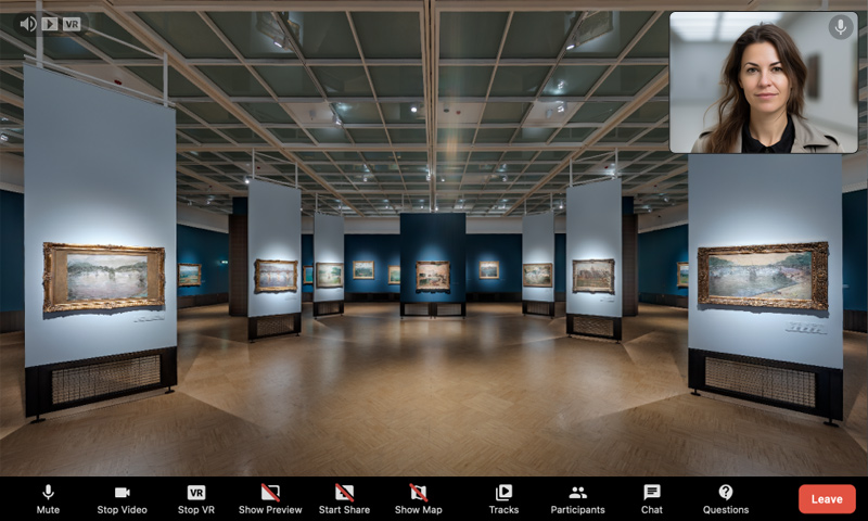 The use of virtual scenes gives the visitor the freedom to view the exhibition, comparable to a physical visit to the museum with the presence of the tour guide. A visitor to an online tour can independently view the virtual scene, if desired, while maintaining the audio accompaniment of the guide, and also, if desired, resume following the guide.
