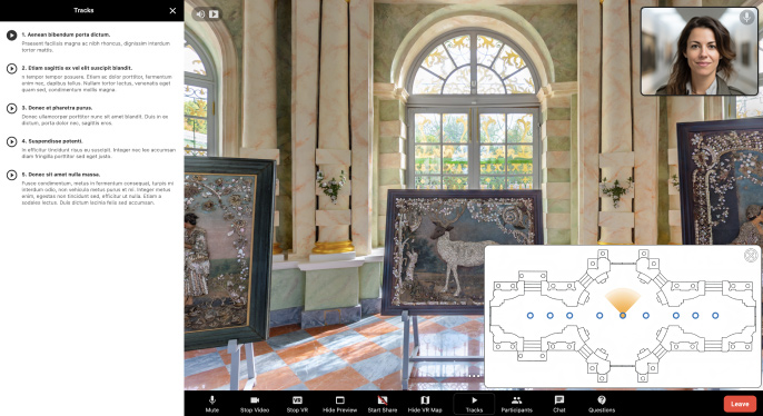 A specialized online guide workplace contains the necessary tools to automate the tour. The guide can record the movement of the virtual scene, and play the recorded movement sequences during the tour. * Audio recordings may also be used in the tour.